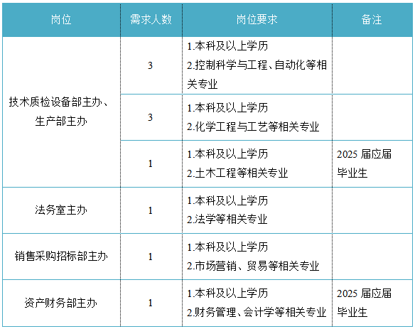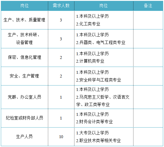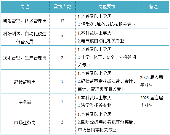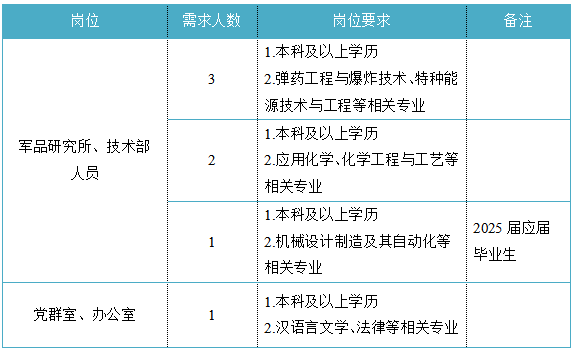 福建省機(jī)電(控股)有限責(zé)任公司(福建省國(guó)防科技工業(yè)公司)是由原省國(guó)防科工辦所屬企業(yè)為主,原省機(jī)械廳所屬企業(yè)劃入組建的省國(guó)資委出資的國(guó)有企業(yè),現(xiàn)有全資、控股和參股企業(yè)48家。 在閩唯一一家地方軍工企業(yè);民爆物品生產(chǎn)與銷(xiāo)售資質(zhì)、軍品科研與生產(chǎn)資質(zhì)、硝酸銨生產(chǎn)與銷(xiāo)售資質(zhì)、營(yíng)業(yè)性爆破作業(yè)單位一級(jí)資質(zhì)、礦山工程施工總承包一級(jí)資質(zhì)、環(huán)保工程專(zhuān)業(yè)承包三級(jí)資質(zhì);國(guó)家甲級(jí)設(shè)計(jì)院,擁有工業(yè)與民用建筑工程設(shè)計(jì)、咨詢(xún)、工程監(jiān)理等綜合資質(zhì);華東地區(qū)最大的硝酸銨生產(chǎn)企業(yè)... 省級(jí)重點(diǎn)實(shí)驗(yàn)室 1個(gè) 省級(jí)工程技術(shù)研究中心 2個(gè) 省級(jí)企業(yè)技術(shù)中心 3個(gè) 省級(jí)技能大師工作室 2個(gè) 五險(xiǎn)二金 帶薪年假 工會(huì)福利 健康體檢 午餐補(bǔ)貼 通訊補(bǔ)貼 文體活動(dòng)...... (一)基本條件 1.具有中華人民共和國(guó)國(guó)籍,擁護(hù)中國(guó)共產(chǎn)黨的領(lǐng)導(dǎo),熱愛(ài)社會(huì)主義; 2.遵紀(jì)守法,無(wú)違法違紀(jì)違規(guī)等不良記錄; 3.具有良好的身體素質(zhì)和心理素質(zhì); 4.具備符合崗位要求的文化程度和工作能力。 (二)資格條件 應(yīng)屆高校畢業(yè)生(含:①2025年度應(yīng)屆高校畢業(yè)生,以畢業(yè)證書(shū)落款年度為準(zhǔn),已簽訂就業(yè)協(xié)議、勞動(dòng)合同、繳交社保等均不影響應(yīng)屆生身份界定;②2024年度畢業(yè)、具有工作經(jīng)歷及社保繳交記錄的高校畢業(yè)生;③畢業(yè)離校兩年內(nèi)未就業(yè)的高校畢業(yè)生,畢業(yè)證書(shū)落款時(shí)間應(yīng)為2023年1月1日以后),具備符合崗位要求的文化程度和工作能力。 聯(lián)系人:吳先生 聯(lián)系電話:0598-3838649 工作地點(diǎn):福建永安 1.福建海峽科化股份有限公司永安分公司(1人) 聯(lián)系人:田經(jīng)理 聯(lián)系電話:0598-3810809 工作地點(diǎn):福建永安 2.福建海峽科化股份有限公司福安分公司(1人) 聯(lián)系人:林經(jīng)理 聯(lián)系電話:0593-6330993 工作地點(diǎn):福建福安 3.福建海峽科化股份有限公司烽林分公司(7人) 聯(lián)系人:吳經(jīng)理 聯(lián)系電話:0598-2792107 工作地點(diǎn):三明明溪 4.福建海峽科化股份有限公司永春分公司(3人) 聯(lián)系人:賀經(jīng)理 聯(lián)系電話:0595-23989536 工作地點(diǎn):福建永春 5.福建海峽科化富興建設(shè)工程有限公司(7人) 聯(lián)系人:楊女士 聯(lián)系電話:18250589968 工作地點(diǎn):福建三明 6.福建民化建設(shè)工程有限公司(2人) 聯(lián)系人:鄒女士 聯(lián)系電話:13950807836 工作地點(diǎn):福建省內(nèi) 7.青海青樂(lè)化工機(jī)械有限責(zé)任公司(22人) 聯(lián)系人:李先生 聯(lián)系電話:0972-8655285 工作地點(diǎn):青海省海東市樂(lè)都區(qū) 8.青海海西東諾化工有限公司(4人) 聯(lián)系人:郭先生 聯(lián)系電話:13860516289 工作地點(diǎn):青海省德令哈市 聯(lián)系人:李先生 聯(lián)系電話:0533-2343718 工作地點(diǎn):山東沂源 聯(lián)系人:米先生 聯(lián)系電話:15280522275 工作地點(diǎn):福建邵武 福建省機(jī)電沿海建筑設(shè)計(jì)研究院有限公司(4人) 聯(lián)系人:李女士 聯(lián)系電話:0591-87386017 工作地點(diǎn):福建福州 福建智和置業(yè)有限公司(2人) 聯(lián)系人:吳先生 聯(lián)系電話:18695719052 工作地點(diǎn):福建福州 符合崗位招聘條件的應(yīng)聘者可請(qǐng)將簡(jiǎn)歷投遞至指定郵箱:fndic25@163.com;并將郵件標(biāo)題和簡(jiǎn)歷名稱(chēng)命名為“崗位+姓名+畢業(yè)院校+專(zhuān)業(yè)”。 即日起開(kāi)始接受報(bào)名,截止時(shí)間為2024年12月31日。 招聘工作按照簡(jiǎn)歷投遞-資格審查篩選-筆試-面試-發(fā)放OFFER-體檢-公示-簽約錄用等程序進(jìn)行。 資格審查貫穿招聘全過(guò)程,在招聘各環(huán)節(jié)若有發(fā)現(xiàn)報(bào)考信息不實(shí)、條件不符等情形的,一律取消應(yīng)聘資格,不得進(jìn)入下一環(huán)節(jié);已經(jīng)錄用的,我司有權(quán)解除勞動(dòng)關(guān)系,由此發(fā)生的個(gè)人損失由應(yīng)聘人員自行承擔(dān)。 按照招聘條件對(duì)應(yīng)聘人員進(jìn)行資格審查,擇優(yōu)確定參加筆試和面試人員。審核通過(guò)者將通過(guò)電話或郵件方式通知,審核未通過(guò)者不再另行通知。 公開(kāi)招聘工作堅(jiān)持“公開(kāi)、平等、競(jìng)爭(zhēng)、擇優(yōu)”的原則,嚴(yán)肅紀(jì)律,秉公辦事,嚴(yán)禁弄虛作假,徇私舞弊,全程接受紀(jì)檢監(jiān)察部門(mén)和社會(huì)的監(jiān)督。報(bào)考者有弄虛作假、違紀(jì)違規(guī)行為的,一經(jīng)發(fā)現(xiàn),均取消其應(yīng)聘資格,并將有關(guān)情況通報(bào)其所在學(xué)校或單位。構(gòu)成犯罪的,依法追究刑事責(zé)任。